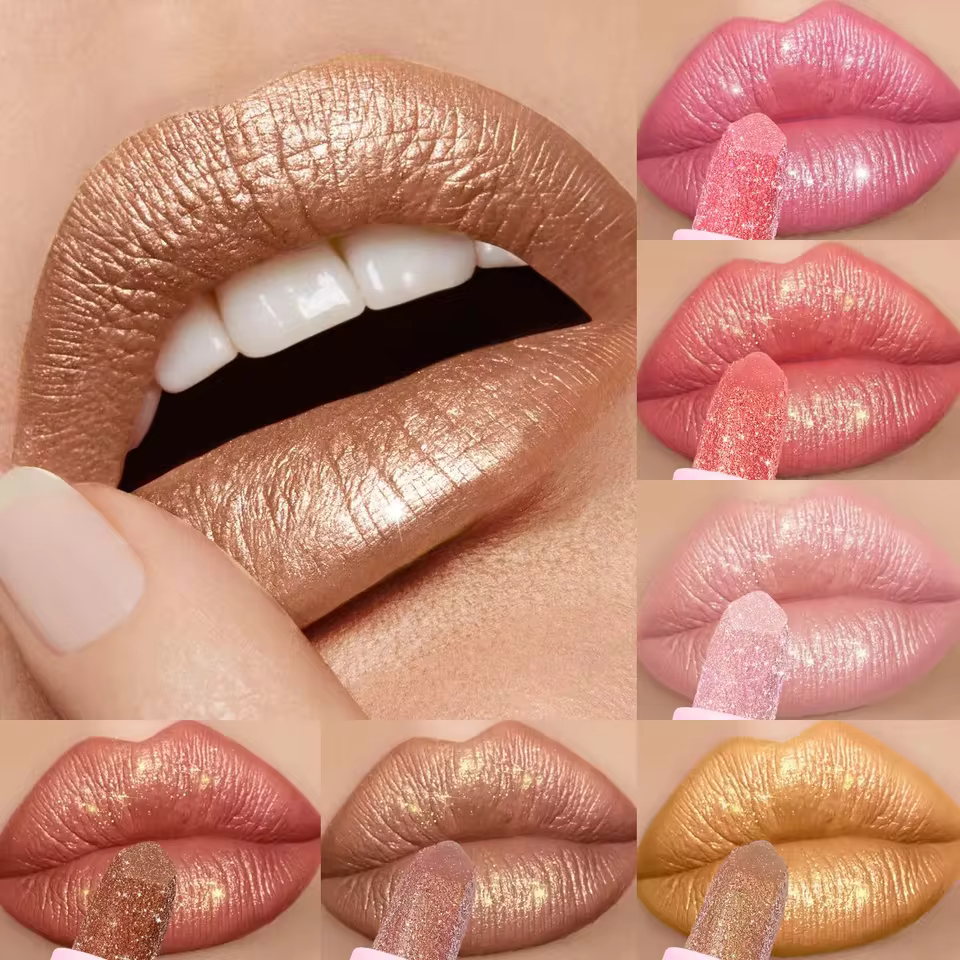 ✨ Finish Metallic: Particulele ultra-fine de shimmer reflectă lumina din toate unghiurile, creând efectul de sidef natural pe buze — spectaculos atât la lumina zilei, cât și la lumina artificială.