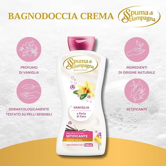Transformă-ți rutina de frumusețe într-un moment de plăcere cu Gelul de Duș Cremă Spuma di Sciampagna "Vaniglia e Perle di Seta". Aceast produs italian este mai mult decât un simplu gel de curățare – este un tratament care lasă pielea incredibil de moale, netedă și învăluită într-un parfum sofisticat.