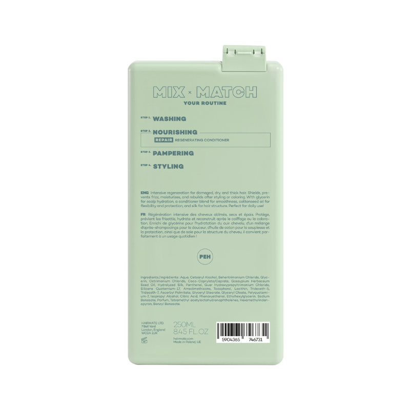 Hrănește și repară-ți părul cu Balsamul de Păr pentru Regenerare Hairmate Repair Conditioner. Acest balsam este conceput special pentru a reface structura firului de păr, oferind o hidratare profundă și un efect de reparare vizibil de la prima utilizare. Formulat cu ingrediente active care ajută la refacerea fibrelor capilare deteriorate, acest balsam lasă părul moale, strălucitor și ușor de pieptănat. Beneficii: