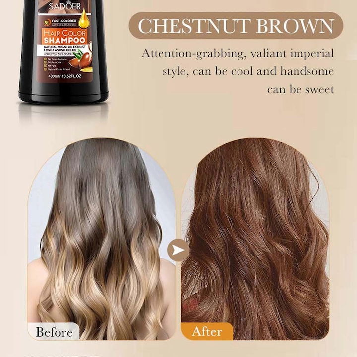 Dorești o nuanță caldă de castaniu și un păr strălucitor, fără să pierzi ore întregi la salon? Șamponul Nuantator Sadoer Chestnut Brown cu Ulei de Argan îți transformă look-ul în doar câteva minute, chiar la tine în baie. Această formulă 3-în-1 spală, colorează și hrănește părul, oferind o nuanță maro-castaniu vibrantă și acoperind firele albe.