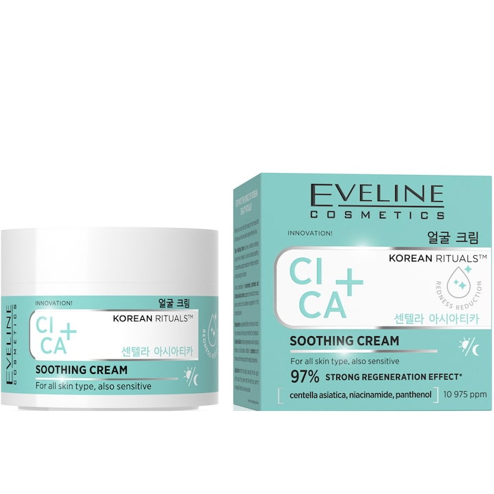 Este o cremă calmantă și regeneratoare din linia Korean Rituals™ a brandului Eveline Cosmetics, inspirată din skincare-ul coreean. Conține un complex activ de 10.975 ppm cu Centella Asiatica, Niacinamidă și Panthenol, cu un efect de regenerare certificat de 97%.