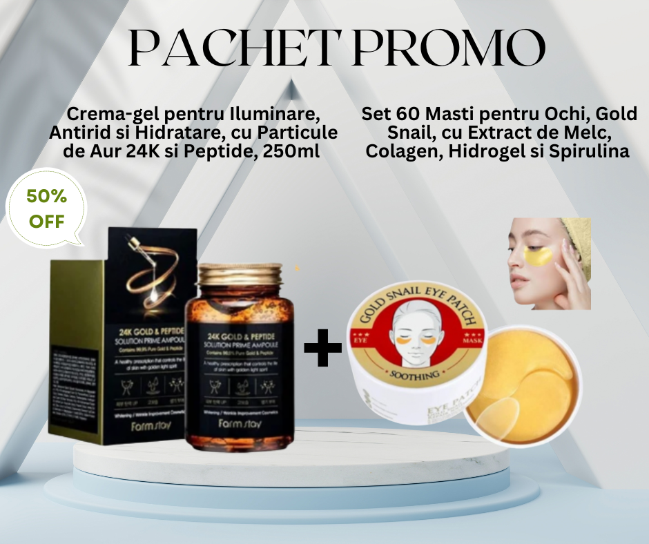 Set 60 Masti pentru Ochi, Gold Snail, cu Extract de Melc, Colagen, Hidrogel si Spirulina Descoperă secretul unei îngrijiri complete pentru zona delicată a ochilor cu setul nostru de 60 de masti pentru ochi, concepuți pentru a oferi beneficii de hidratare intense și îngrijire profundă. Fiecare set conține 60 de plasturi, perfecte pentru a fi incluse în rutina ta de frumusețe pentru a menține un aspect proaspăt și luminos al pielii din jurul ochilor. Beneficii: Hidratare Intensă: Formula plasturilor combină colagenul, hidrogelul și spirulina pentru a oferi o hidratare profundă și o nutriție esențială pielii.
