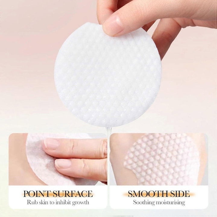 Ordinea contează: (1) Începeți cu fața texturată (POINT SURFACE) – plasați-o pe zona afectată și masați ușor cu mișcări circulare 2–3 minute. Bumps-urile texturate amplifică penetrarea BHA și exfolierea mecanică blândă. (2) Întoarceți discheta la fața netedă (SMOOTH SIDE) și tamponați blând aceeași zonă 2–3 minute pentru calmare, hidratare și aplicarea Vitaminei C + Niacinamidei. Nu clătiți după. Continuați cu hidratantul.