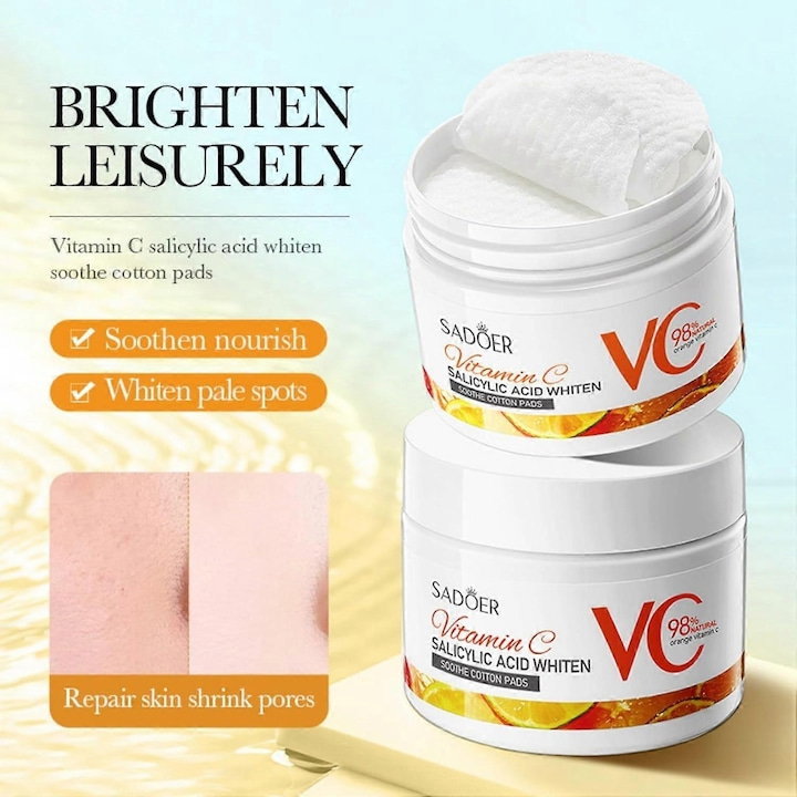 🍊 Ten cu acnee, pori dilatați, pete pigmentare și lipsă de strălucire? Dischetele Sadoer Vitamin C + Acid Salicilic cu Niacinamidă acționează pe trei fronturi simultan – exfoliază, iluminează și calmează – cu 98% Vitamina C naturală din portocale, în 55 de dischete duble față pentru o rutină completă: Sadoer VC Salicylic Acid Whiten Soothe Cotton Pads.